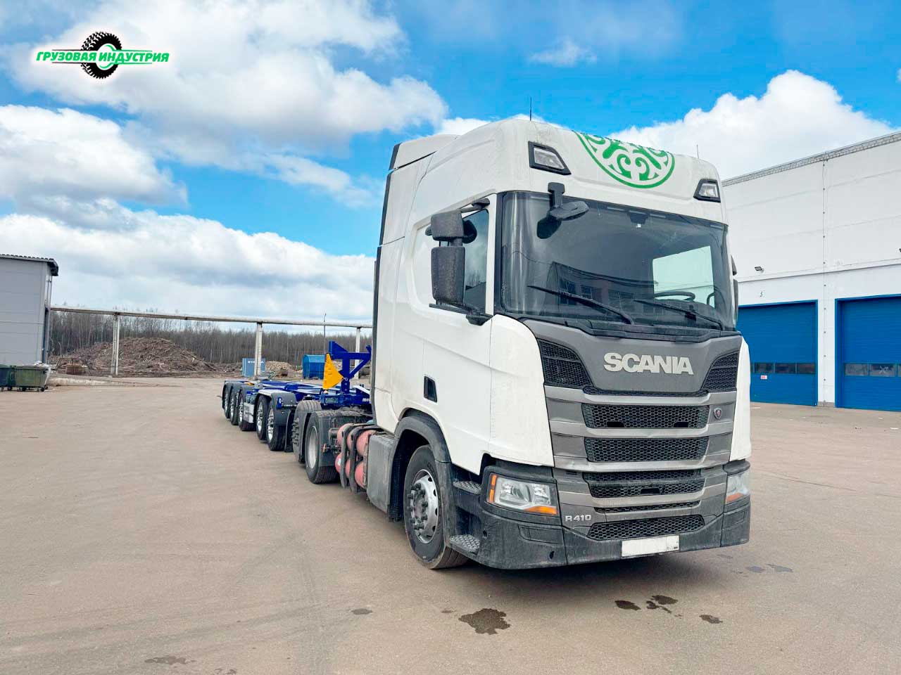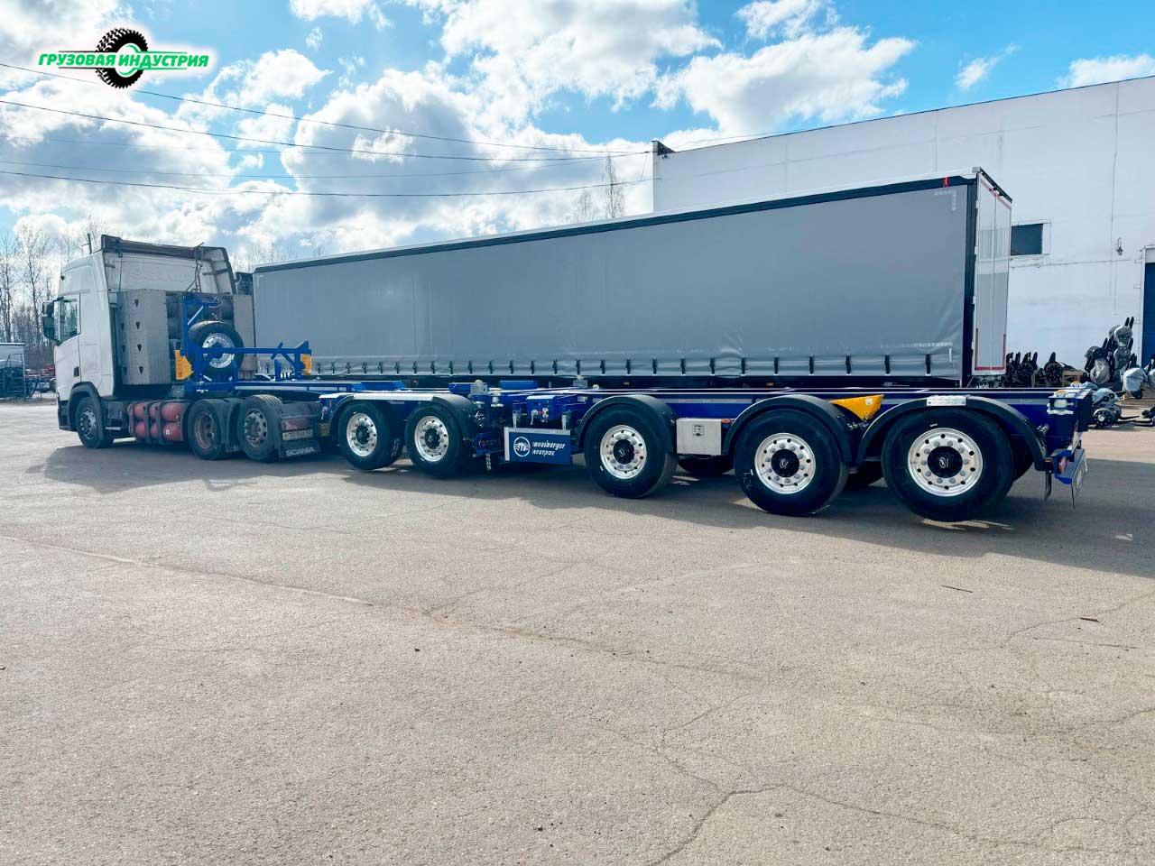 Отгрузка сцепки: тягач Scania и универсального полуприцепа тандемного контейнеровоза Meusburger Новтрак SW-570 в Ростов на Дону.